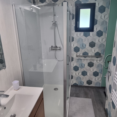 Salle de bain avec douche, lavabo, machine à laver le linge.