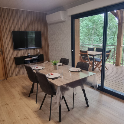 Le Gîte La Mélano dispose d’une pièce à vivre (canapé, TV Ecran plat Ambilight, table à manger) ouverte sur une grande terrasse,
